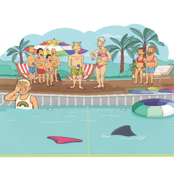 However, it wouldn’t be a Snappycards creation without a touch of humor and surprise hidden in the water. In the foreground, a man is seen covering his eyes, perhaps playing a game or hiding from the chaos, while a shark fin and a discarded pink swimsuit float nearby. These funny details add a layer of narrative wit to the Gays Chatting 3D Pop Up Card.